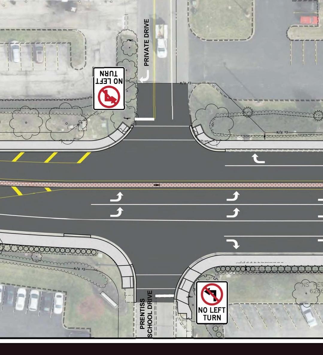 Limiting Prentiss School drive to a right in/ right out condition along with moving the primary access to the shopping center further west into the new roundabout will allow for a safer and more efficient traffic condition. Traffic will flow more smoothly with the elimination of left turns and crossovers at Prentiss School.