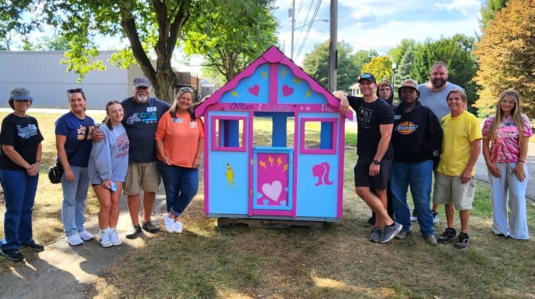 The Groom family with the Robinson family after a day’s work! Photo by Lisa McCuistonMayor Angie Kirk helps paint some playhouse walls. Photo by Theresa GareeKevin Groom applies coats of…